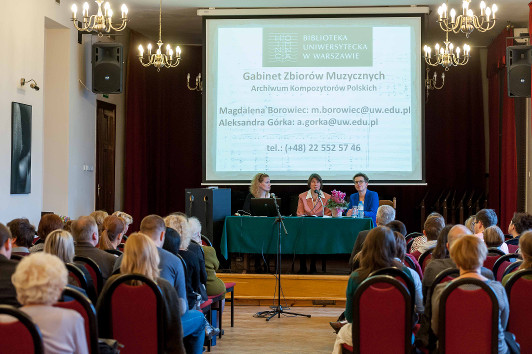 The conference was attended by 56 participants from 36 institutions – the National Library of Poland, music academy and university libraries, music departments of university and public libraries, musicological libraries, the Fryderyk Chopin Institute, Institute of Music and Dance, National Film Archive – Audiovisual Institute, Polish Radio Archive, Polish Television Archive, Polish Academy of Sciences – Library in Gdańsk, the Institute of Art of the Polish Academy of Sciences and the Leon Wyczółkowski Regional Museum in Bydgoszcz. Among the participants there were music librarians, musicologists, researchers of music and phonographic sources, as well as specialists in the field of archive recordings.